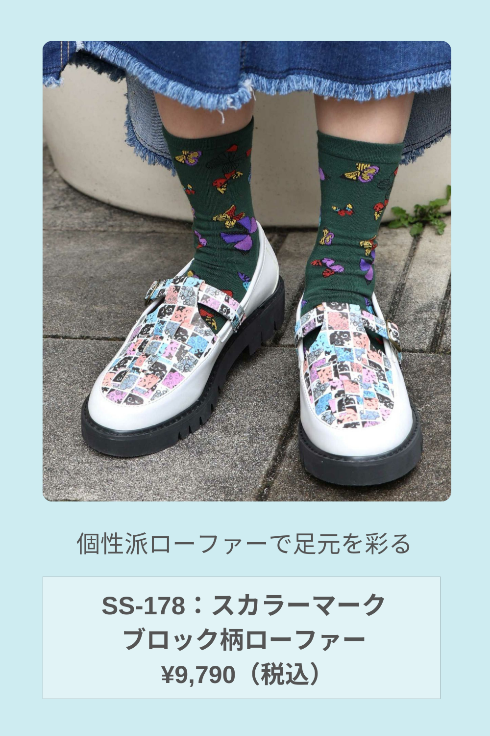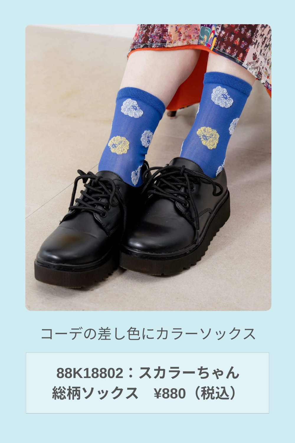 ブルーのソックスがアクセントになったコーデ。