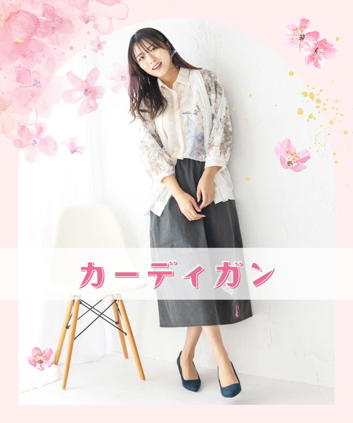 春らしい軽やかなカーディガンと白のトップス、デニムを合わせることで、
