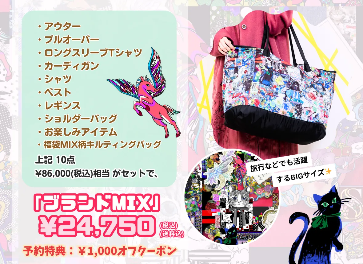福袋バッグもたっぷり容量で、コラージュされたMIX柄が特別感のあるデザイン。