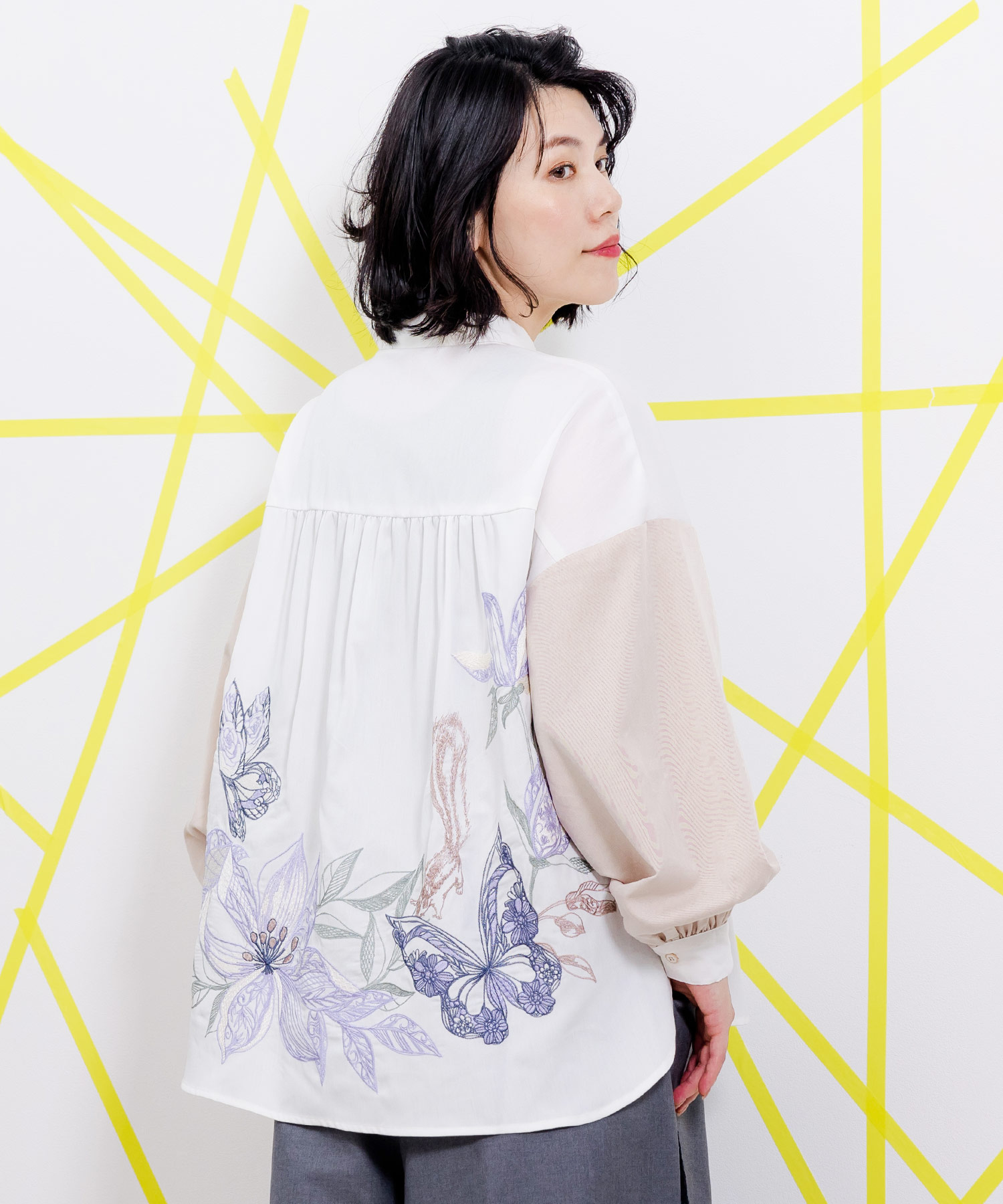 | 【限定】刺繍シャツ ぽわんとした配色袖が丸みのあるやさしいシルエット。 振り返ると華やかな花と蝶の刺繍が後ろ姿まで美しく彩ってくれます。 |