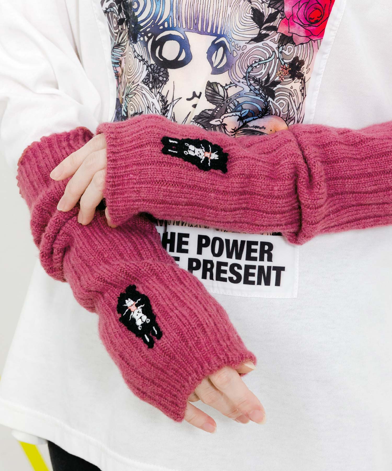 【限定】2WAYアームウォーマー 足首ウォーマーとしても使えるアームウォーマーはウール入りで指先まで温か。ピンクのカラーとラビルの刺繍が愛らしいデザイン! |